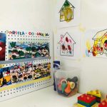 El arte mural es fundamental en el proyecto de arte para niños. Es necesario que tengan acceso directo al material, no muy extenso, pero bastante significativo. En este proyecto, junto con Laura, montamos el mural. Estuvimos componiéndolo durante dos semanas. Consta de un inserto explicativo de las obras presentes en el cubo mágico de Miró, tres fotos impresas, dos postales de Miró, un títere.